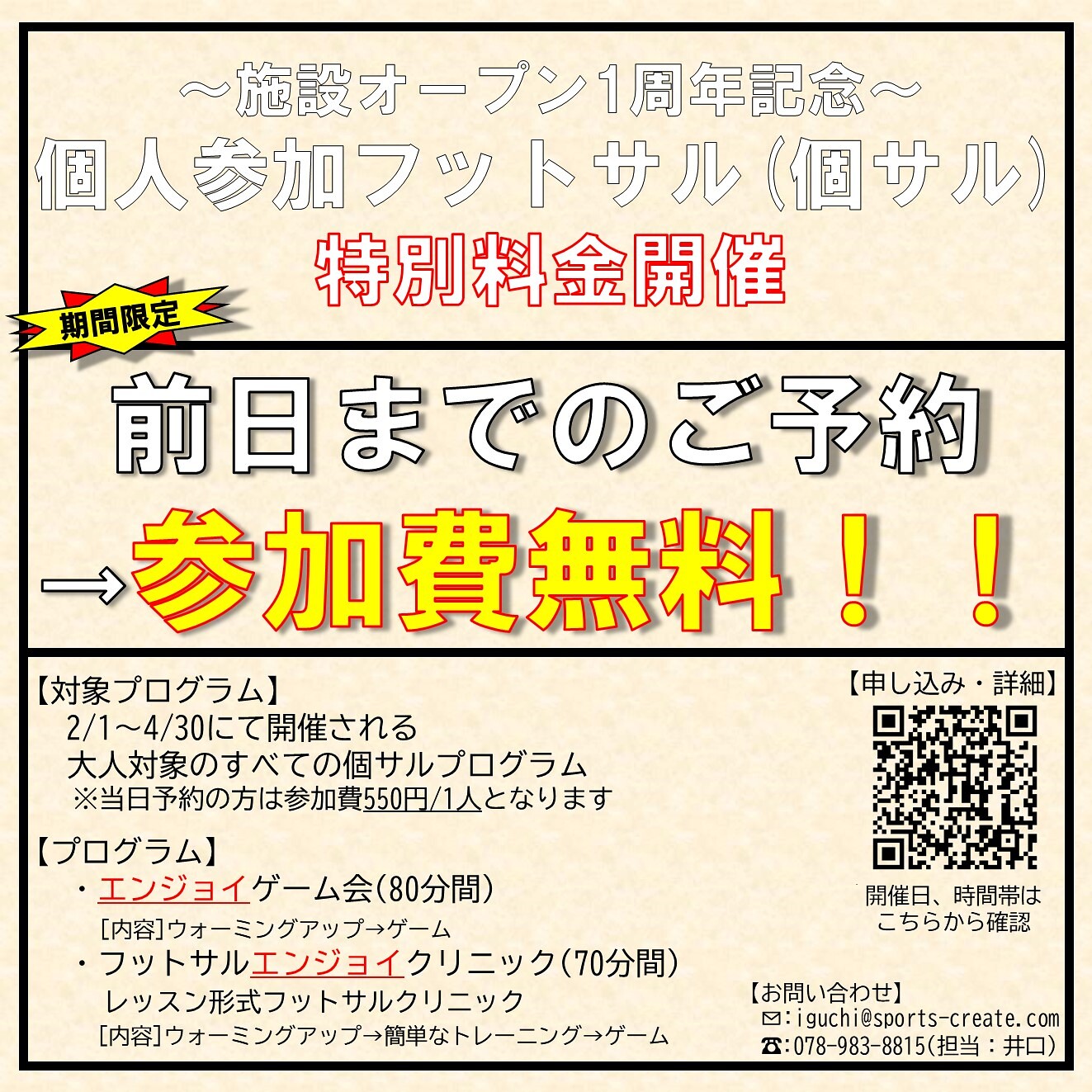 オープン1周年ということで、個サル(個人参加型フットサル)にてキャンペーンを実施いたします!!